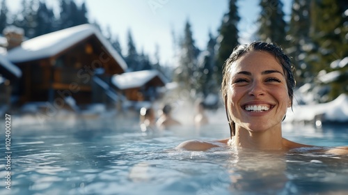 A vibrant woman, radiating joy, immerses herself in a hot spring with a backdrop of snow-covered cabins, creating a serene winter getaway scenery.