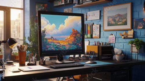 A vibrant workspace featuring a computer screen displaying a scenic landscape.