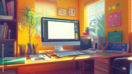 A vibrant workspace with a computer, stationery, and plants, designed for creativity.