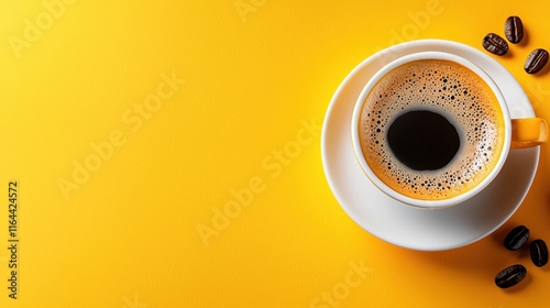 A vibrant yellow backdrop features a steaming cup of coffee beside scattered coffee beans, creating a warm and inviting atmosphere.