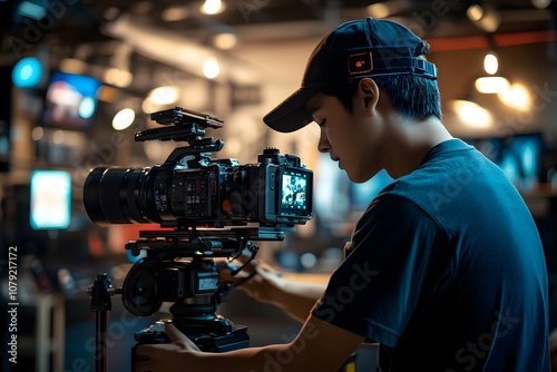 A videographer setting up a camera and lighting for a commercial shoot, preparing a professional setup