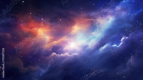 A view of a dark night sky with numerous stars shining through fluffy clouds. Generative AI