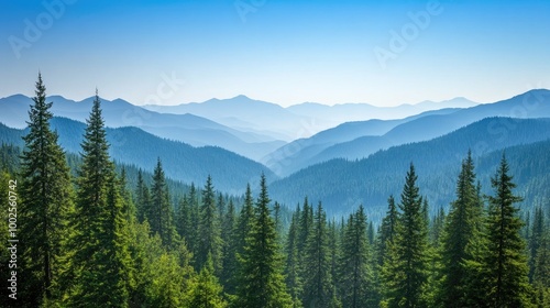 A view of a forested mountain range, with layers of trees stretching to the horizon under a clear, blue sky.