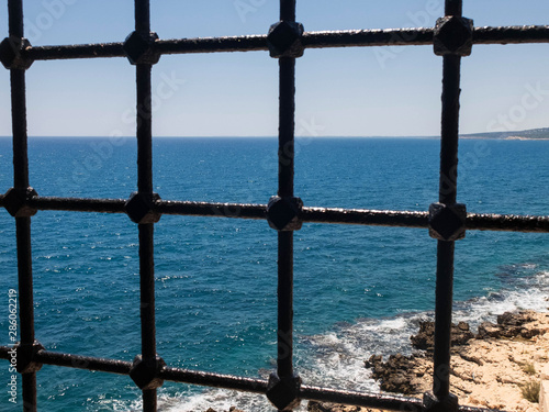 A view of sea and coastline through the metal bars of ancient building window