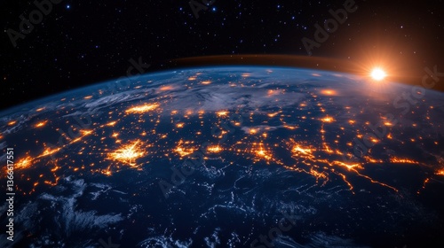 A view of the Earth at night with a bright sun in the sky