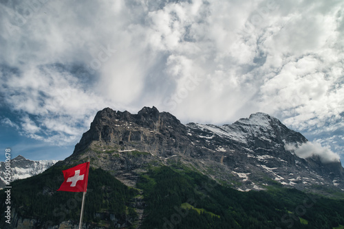 A view of the Eiger and Monch massif from Grindelwald, Switzerland with the Swiss flag flying.