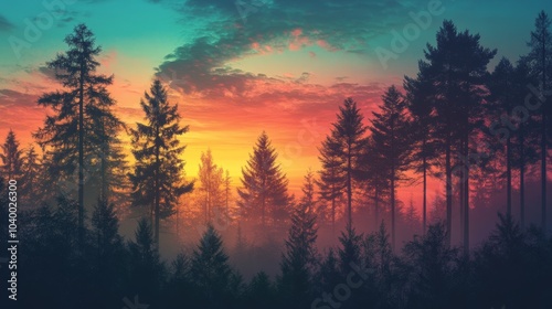A view of the forest at sunset, with tall trees silhouetted against the colorful sky, creating a peaceful and natural atmosphere.