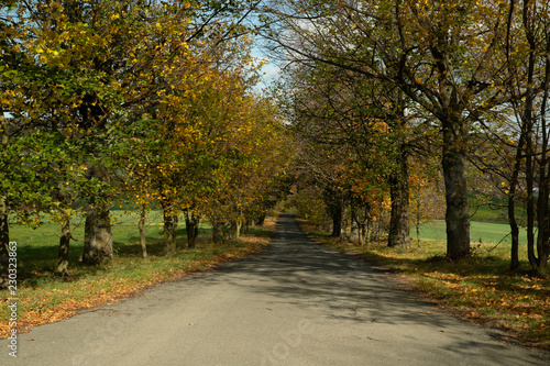 A view of the hill called Helfštýn on the field and its surroundings and the path that leads to monuments during the autumn