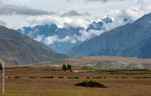 A view of the snow capped Andes Mountain range as seen from the farming land near Maras in Peru. Maras is a town in the Sacred Valley of the Incas, 40 kilometers north of Cusco.