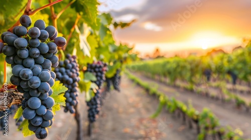 A vineyard pathway lined with grapevines, leading to a sunset horizon, with grapes hanging heavily from the vines