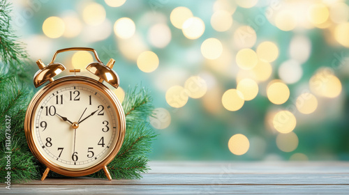 A vintage alarm clock rests on a wooden surface, surrounded by evergreen branches, with a blurred background of warm, glowing bokeh lights.
