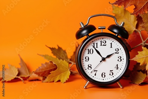 A Vintage Alarm Clock Surrounded by Autumn Leaves on an Orange Background, Signifying the Transition into Fall and the Change of Seasons in Nature