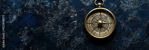 A vintage brass compass with detailed engravings, placed on a deep navy blue background