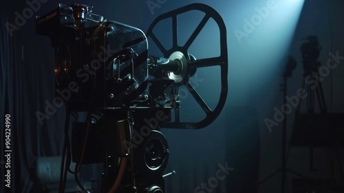 A vintage film projector in a dark studio, illuminated by soft lighting, evoking a nostalgic atmosphere and the art of filmmaking.