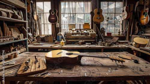 A vintage guitar-making scene frozen in time, emphasizing heritage and tradition