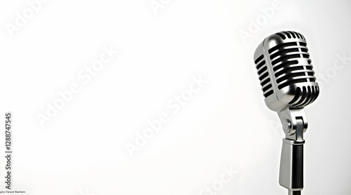 A vintage microphone stands against a white background, symbolizing music, performance, and nostalgia with its classic design and polished look