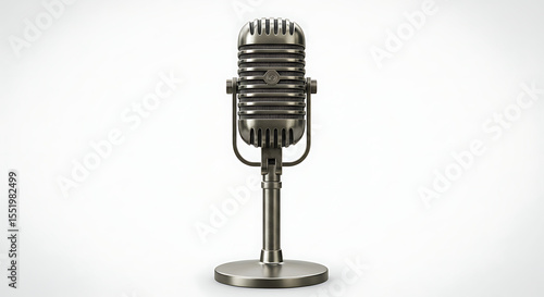 A vintage microphone stands in stark elegance, its metallic structure gleaming with a timeless aesthetic, inviting the potential for creative expression, be it music, talk, or podcasting.
