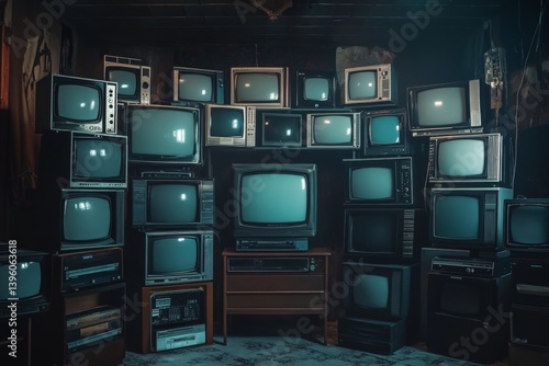A vintage room filled with old televisions and computers, capturing a dark cinematic atmosphere