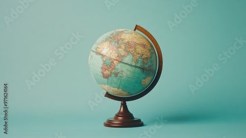 A vintage-style globe on a wooden stand against a light blue background.