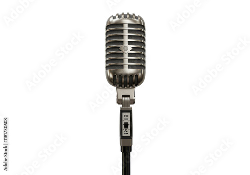 A vintage-style microphone with a polished metallic finish, mounted on a stand, isolated on a white background