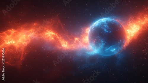 A virtual planet with blue and red energy waves orbiting in a modern technology concept