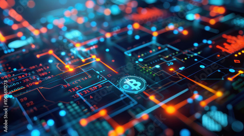 A visual of blockchain technology investment, with symbols of decentralized finance, cryptocurrency, and digital assets driving financial growth.