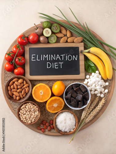 A visual representation of the "Elimination Diet" on a wooden board with assorted fresh ingredients. The scene includes a small chalkboard, and fresh, healthy foods
