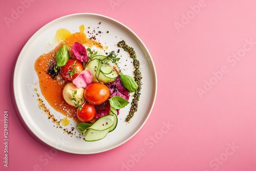 A visually striking arrangement of cherry tomatoes showcases culinary art at its finest. The high-contrast plating elevates the tomatoes to resemble a sophisticated modern painting.