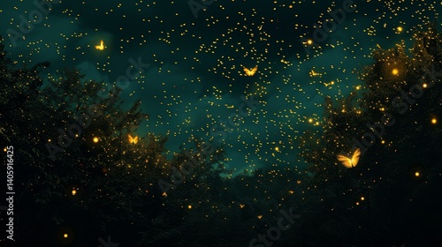 A visually striking composition featuring a swarm of fireflies illuminating the night sky, forming intricate patterns reminiscent of a celestial ballet. The dark background accentuates the glow