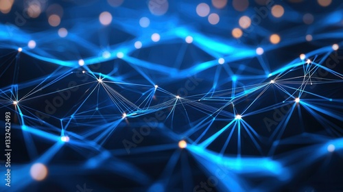 A visually striking digital network grid with interconnected lines nodes and dots in shades of bright blue set against a dark and mysterious abstract background evoking a sense of technology