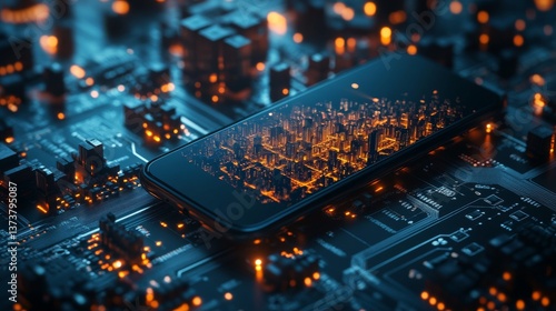 A visually striking image of a smartphone on a detailed circuit board, showcasing a glowing cityscape reflection. The orange and blue lighting conveys a high-tech, futuristic vibe, ideal for