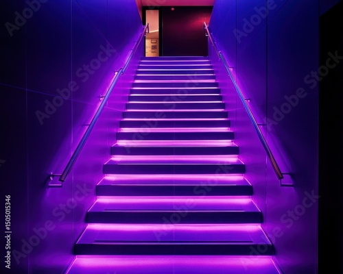 A visually striking neon staircase glowing in rich purple hues, set in a sleek, dark environment that radiates mystery and style.