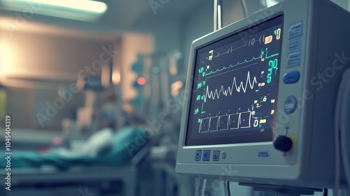 A vital signs monitor showing stable readings with a steady pulse line, set in a clean, organized hospital room, creating a sense of calm in patient care