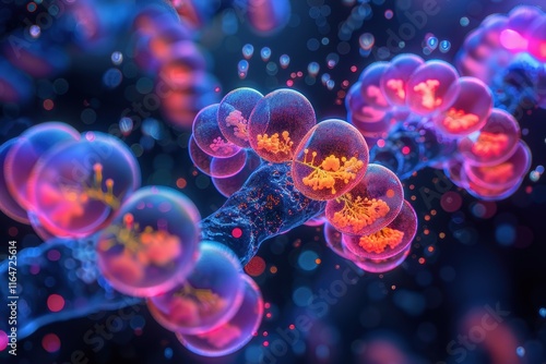 A vivid and detailed macro view showcasing intricate molecular structures with vibrant colors, representing cutting-edge scientific exploration in microbiology or nanotechnology