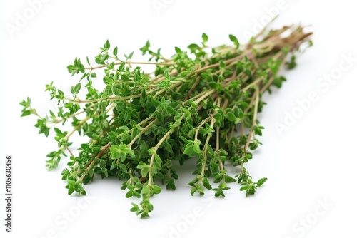 A vivid bundle of fresh thyme herb resting against a crisp white background, showcasing vibrant green leaves that suggest freshness and culinary versatility.