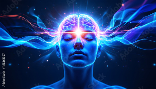 A vivid depiction of a meditative person radiating energy, with a glowing third eye and vibrant energy waves emanating, symbolizing enlightenment and mindfulness.