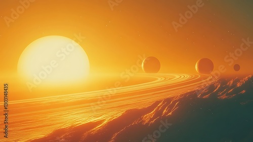 A vivid depiction of a planetary system with multiple moons orbiting a glowing gas giant