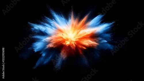 A vivid explosion of colorful powder against a dark background forms a cloud-like shape, reminiscent of stylized wings or a plume