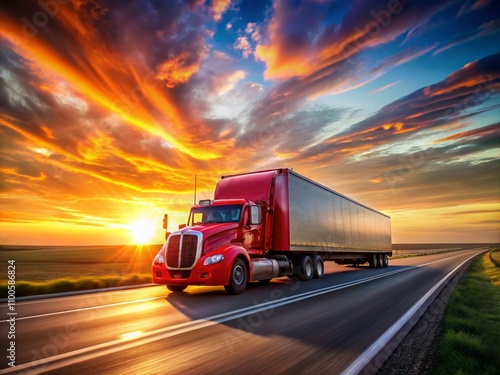 A Vivid Red Semi-Truck Speeds Along an Open Highway at Sunset, Capturing the Essence of Motion and Freedom in Scenic Landscape Photography