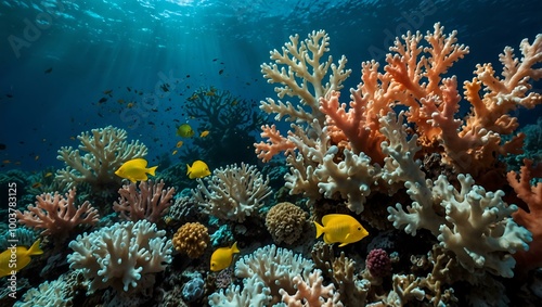 A vivid underwater coral scene reveals fish amid a bleached reef, emphasizing climate change's effects.