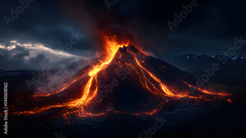 A volcanic eruption releases glowing lava that flows down the mountain side, with cracks and fissures creating a fiery display in the dark of night.