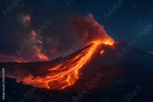 A volcano erupting at night with lava flowing down the side and a starry night sky above it all
