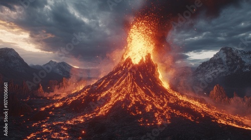 A volcano erupts with lava and smoke, creating a fiery and dangerous scene