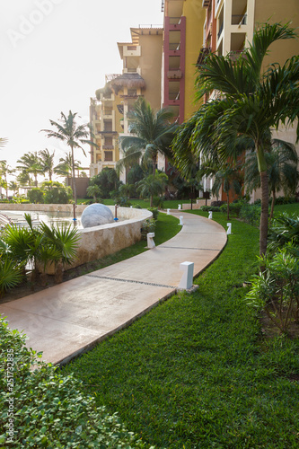A walking path with garden and palm trees at a high end Mexican resort near Cancun.
