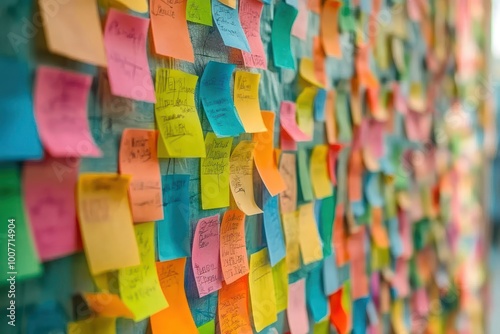 A wall covered with colorful sticky notes with handwritten messages on them.