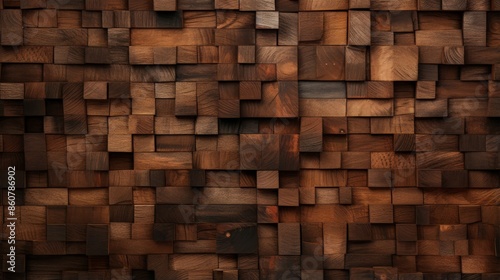 A wall made of variously sized wooden panels creates a warm and intricate abstract pattern, adding depth and a sense of coziness through its rich textures and tones.