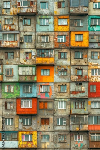 A wall of Soviet panel buildings, with a texture of concrete and a gray color with small windows.