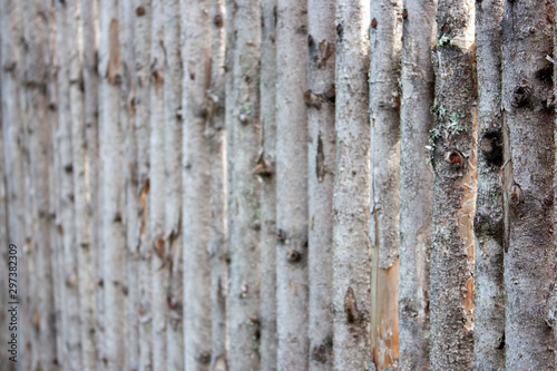 A wall of thin trunks of birches. White trunks of birches are tightly pressed against each other. Side view