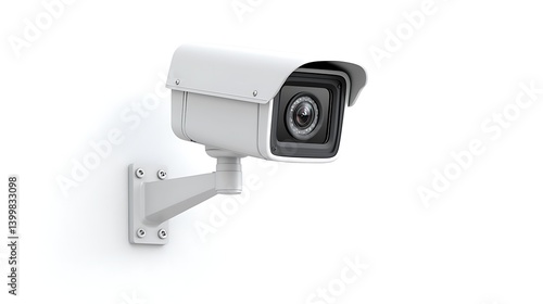 A wall-mounted security camera designed for surveillance, featuring a sleek, modern appearance and protective cover for lens durability.