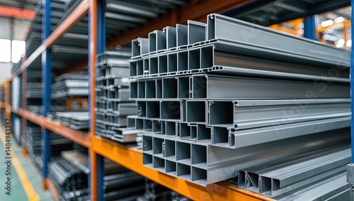 A Warehouse Shelf with Neatly Stacked Metal Profiles, Demonstrating Organized Storage of Industrial Materials